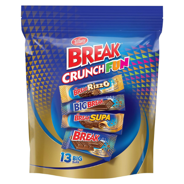 - An assortment of 13 big snack bars with four varieties of Crunchy wafer filled chocolates