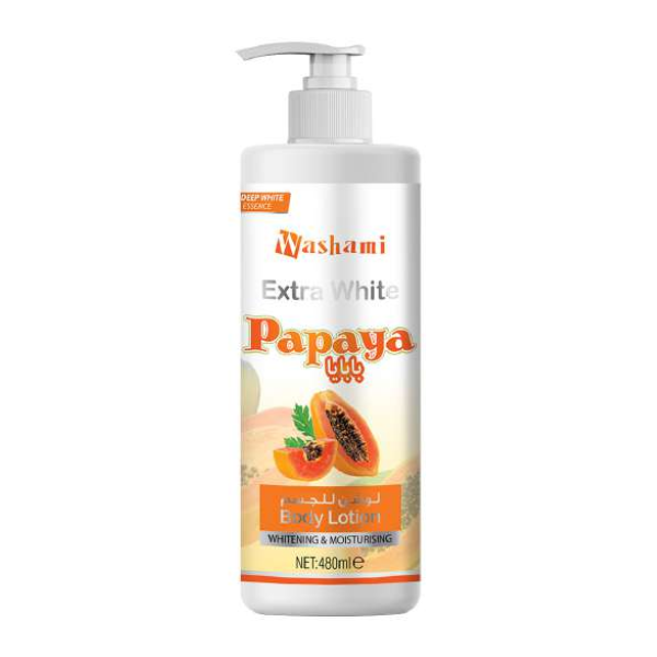 “Washami Extra White Papaya Body Lotion.” The lotion is packaged in a white plastic bottle with a white pump dispenser. It has a net volume of 480ml. The bottle features an image of a papaya fruit and has text in both English and Arabic.
